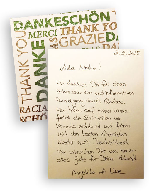 И нам грустно, что мы расстались. Ваша любовь к Квебеку звучала в каждом вашем слове, и мы полюбили этот город благодаря вам. Не хочется уезжать.